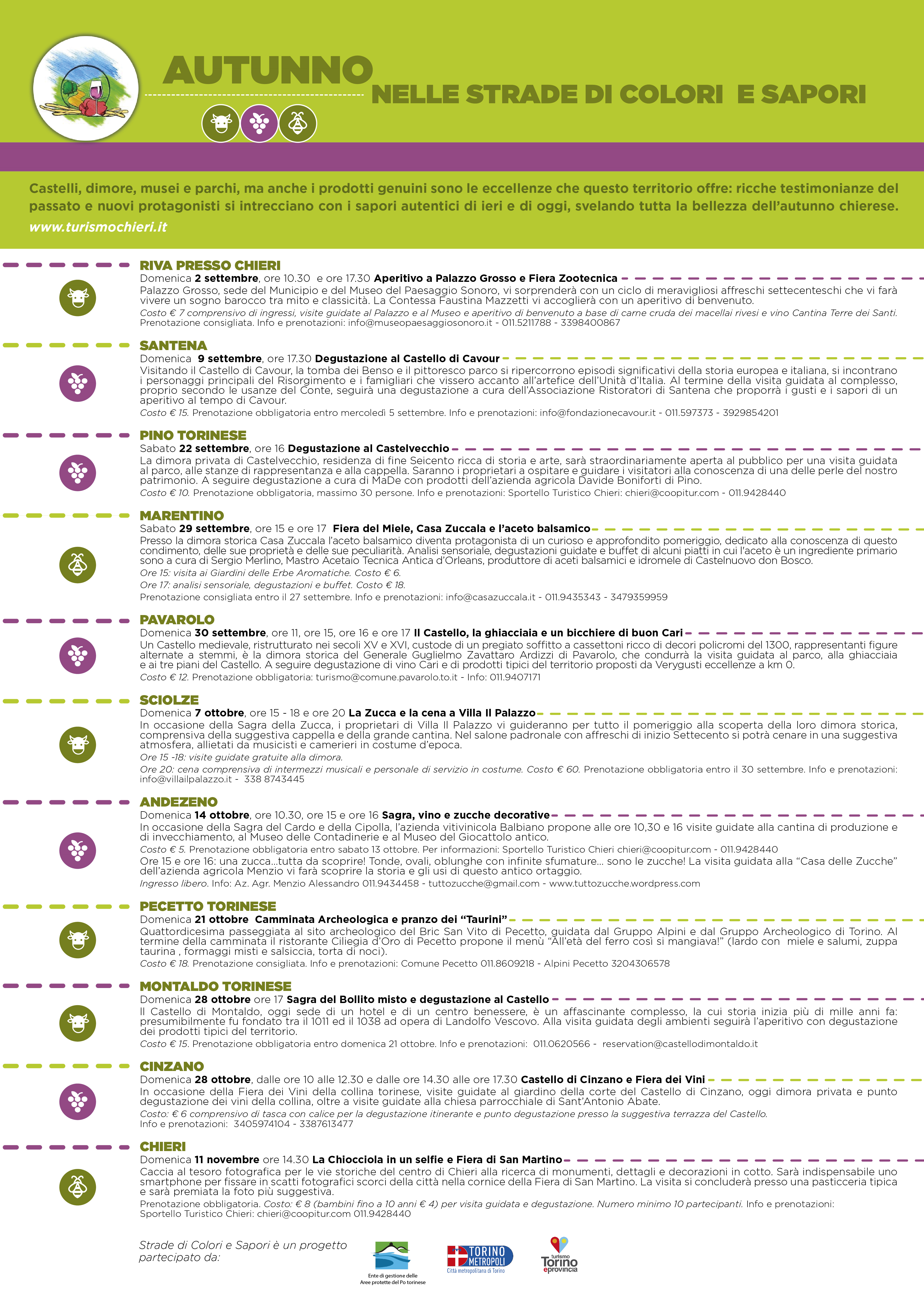 Fitto calendario di eventi che dall’inizio di settembre alla metà di novembre consentiranno di assaporare la bellezza dei castelli, delle dimore storiche e dei musei del Chierese e della Collina Torinese. Sono in programma visite guidate, ma anche camminate e sagre dedicate ai sapori autentici del territorio.