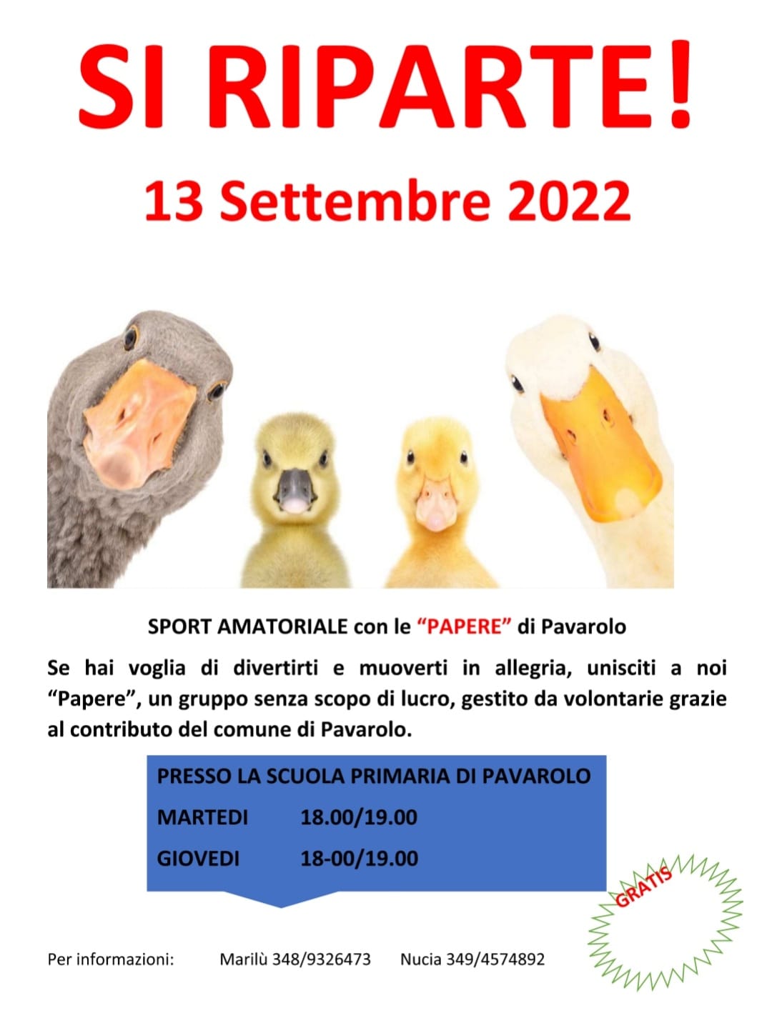 Attività sportive e culturali 2022-23 organizzate dalle associazioni, gruppi sportivi, proloco e gruppi di libero volontariato sono realizzate nell'edificio scuola elementare (Pavarolo via maestra,36).