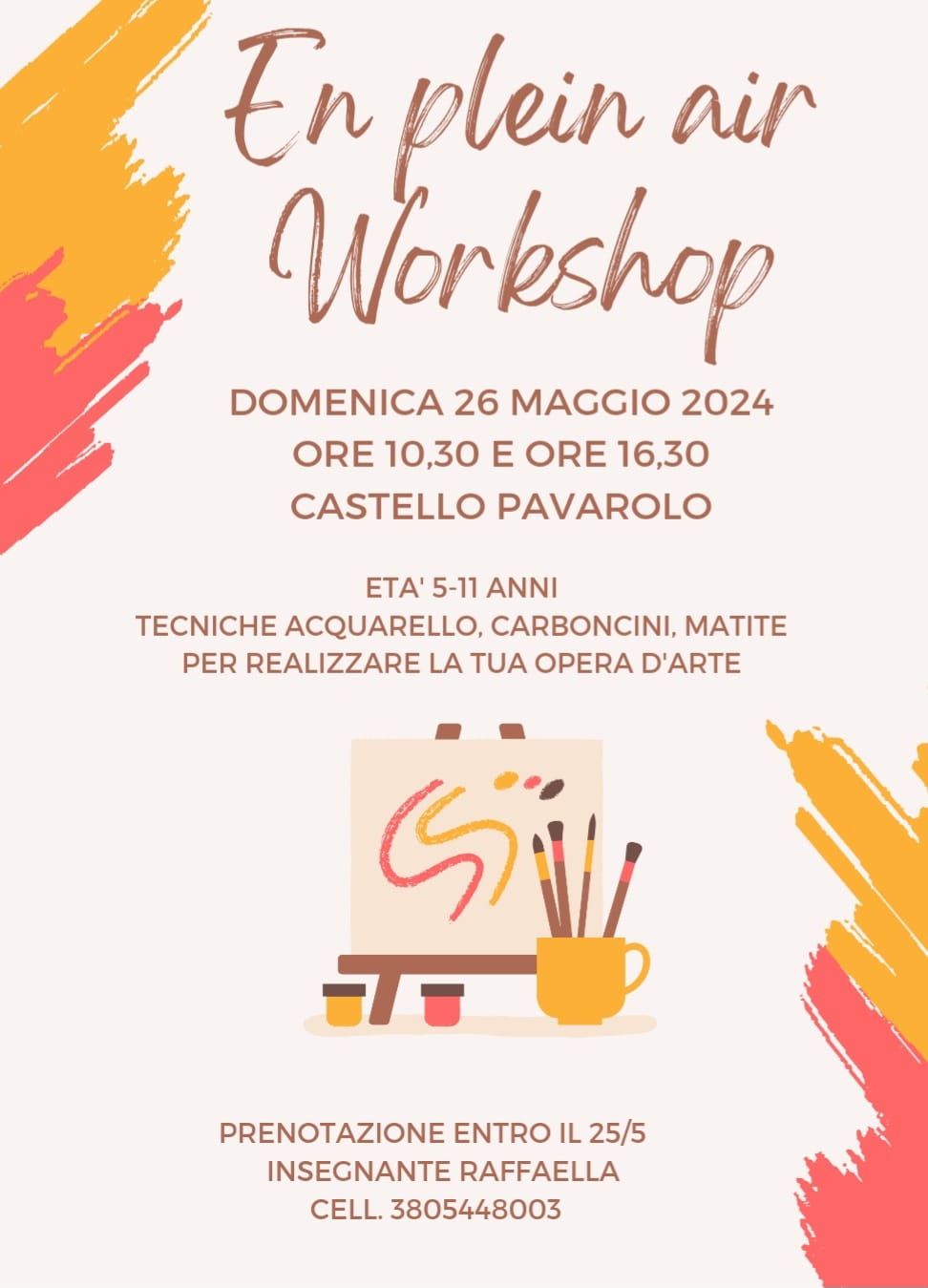 NEL PARCO DEL CASTELLO è possibile partecipare al laboratorio En Plein Air workshop (bambini 5-11 anni) organizzato da Raffaella Rochira (vedi locandina allegata) nei seguenti orari: