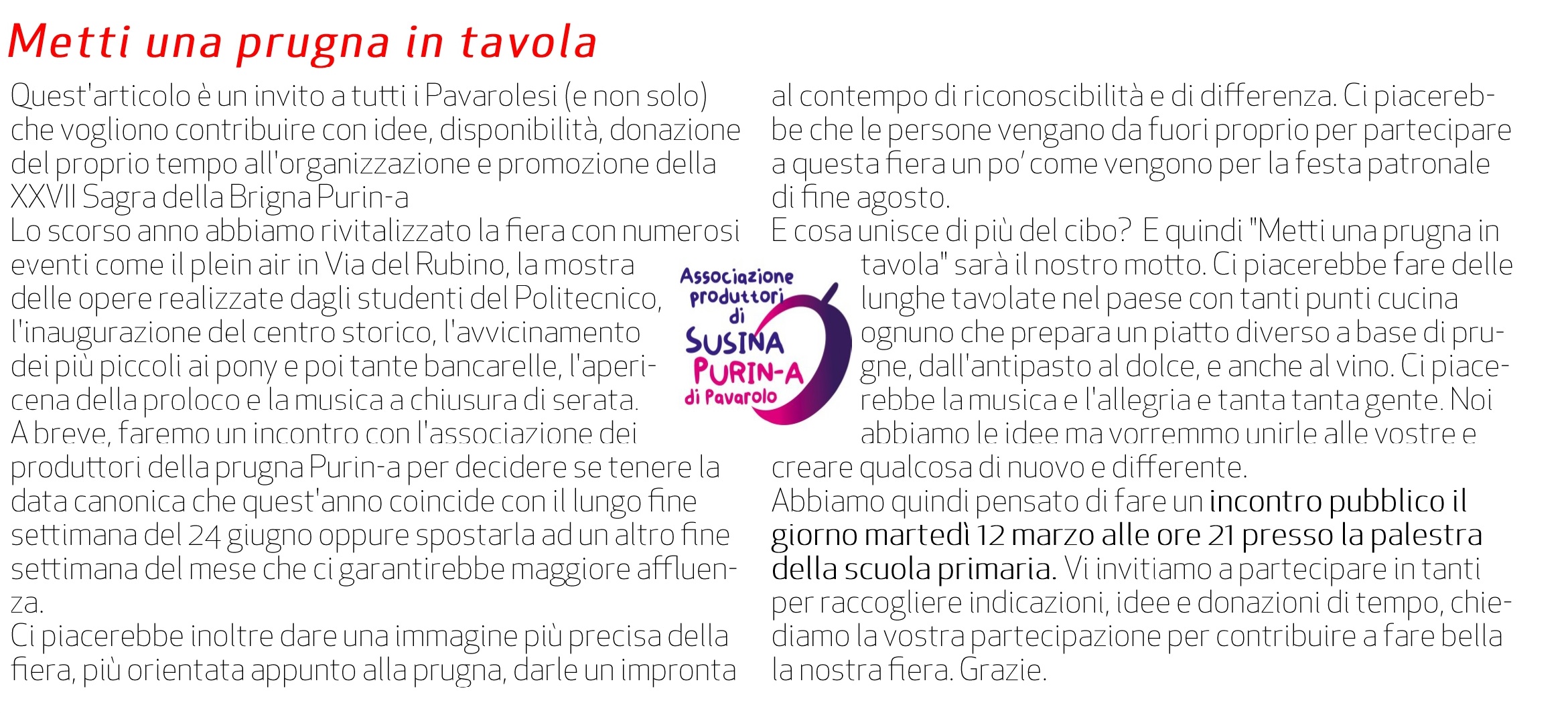 Quest'invito è rivolto a tutti coloro che intendono contribuire con idee, o con donazioni del proprio tempo, e partecipare attivamente alla XXVII fiera della brigna purin-a.