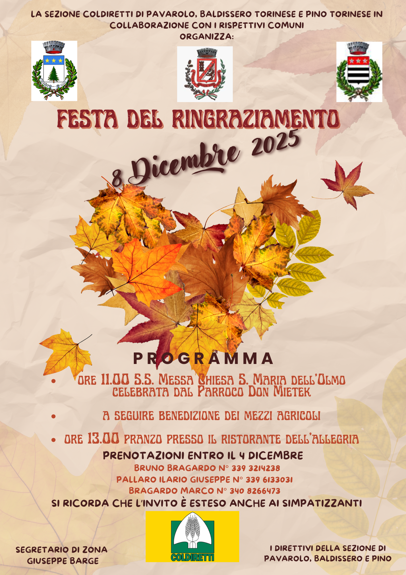 La Sezione Coldiretti di Pavarolo, Baldissero T.se e Pino T.se, in collaborazione con i rispettivi Comuni organizzano per Lunedi 8 Dicembre 2025 - La Festa del Ringraziamento