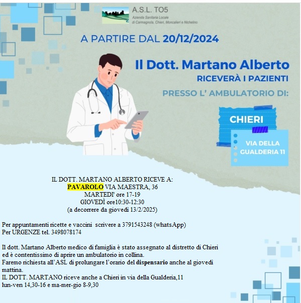IL DOTT. MARTANO riceve anche a Chieri in via della Gualderia,11 lun-ven 14,30-16 e ma-mer-gio 8-9,30