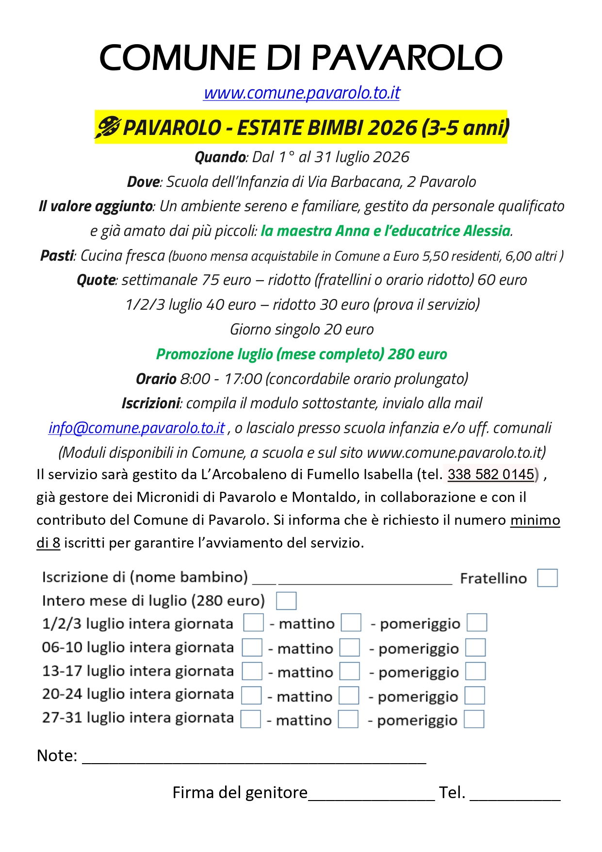 Il Comune di Pavarolo, in collaborazione con ASD Pavarolo Sport e L’Arcobaleno, invita tutti i bambini e i ragazzi dai 3 ai 16 anni a vivere un’estate indimenticabile tra sport, gioco e natura.