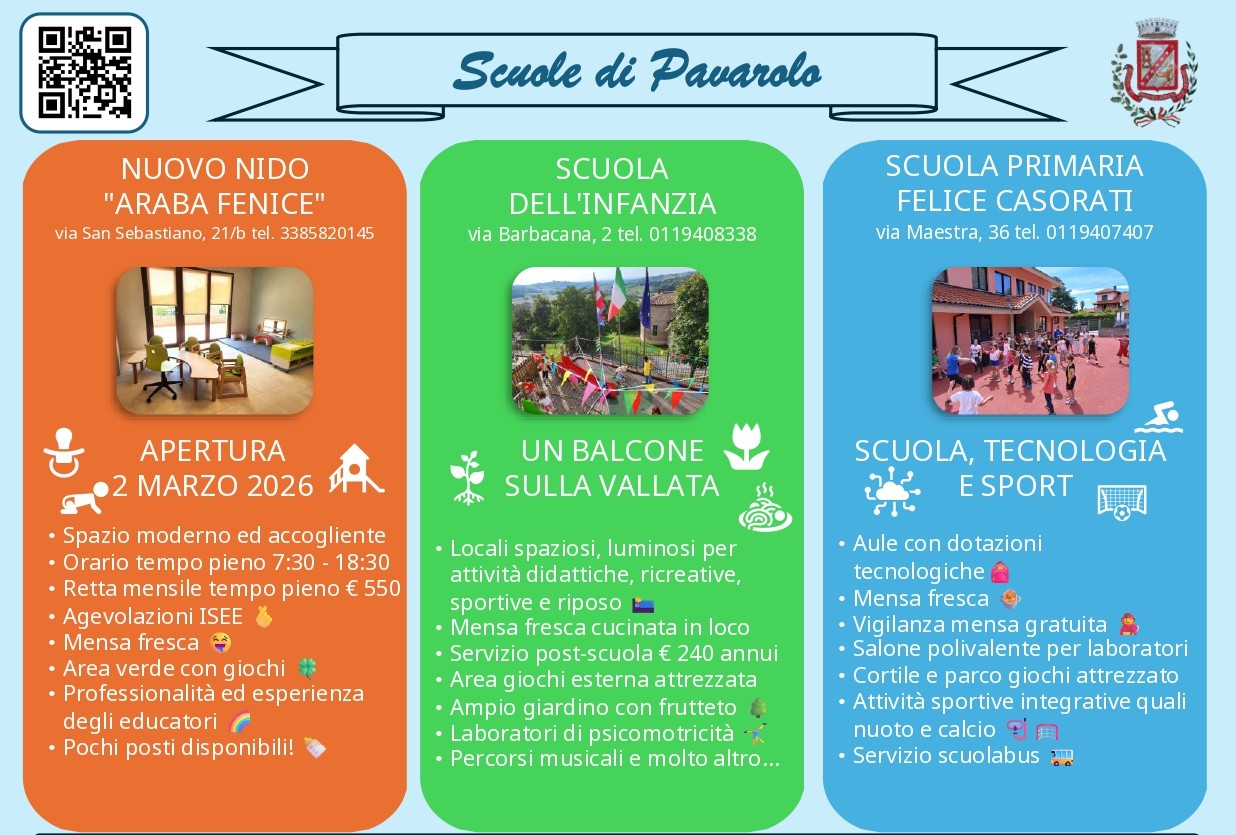 Dal 2026 LE SCUOLE DI PAVAROLO CRESCONO e offrono servizi da 1 a 11 anni (nido/infanzia/primaria)