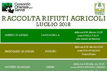 Nel mese di luglio viene organizzata dal Consorzio Chierese per i Servizi con la collaborazione delle Associazioni di categoria la raccolta gratuita dei rifiuti agricoli.