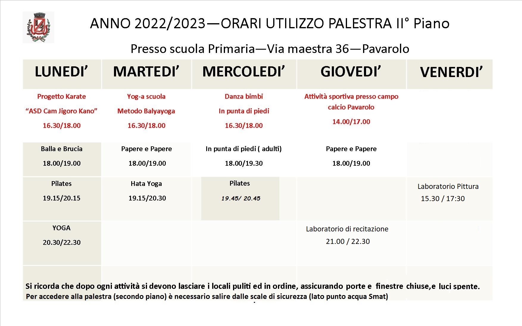 Attività sportive e culturali 2022-23 organizzate dalle associazioni, gruppi sportivi, proloco e gruppi di libero volontariato sono realizzate nell'edificio scuola elementare (Pavarolo via maestra,36).
