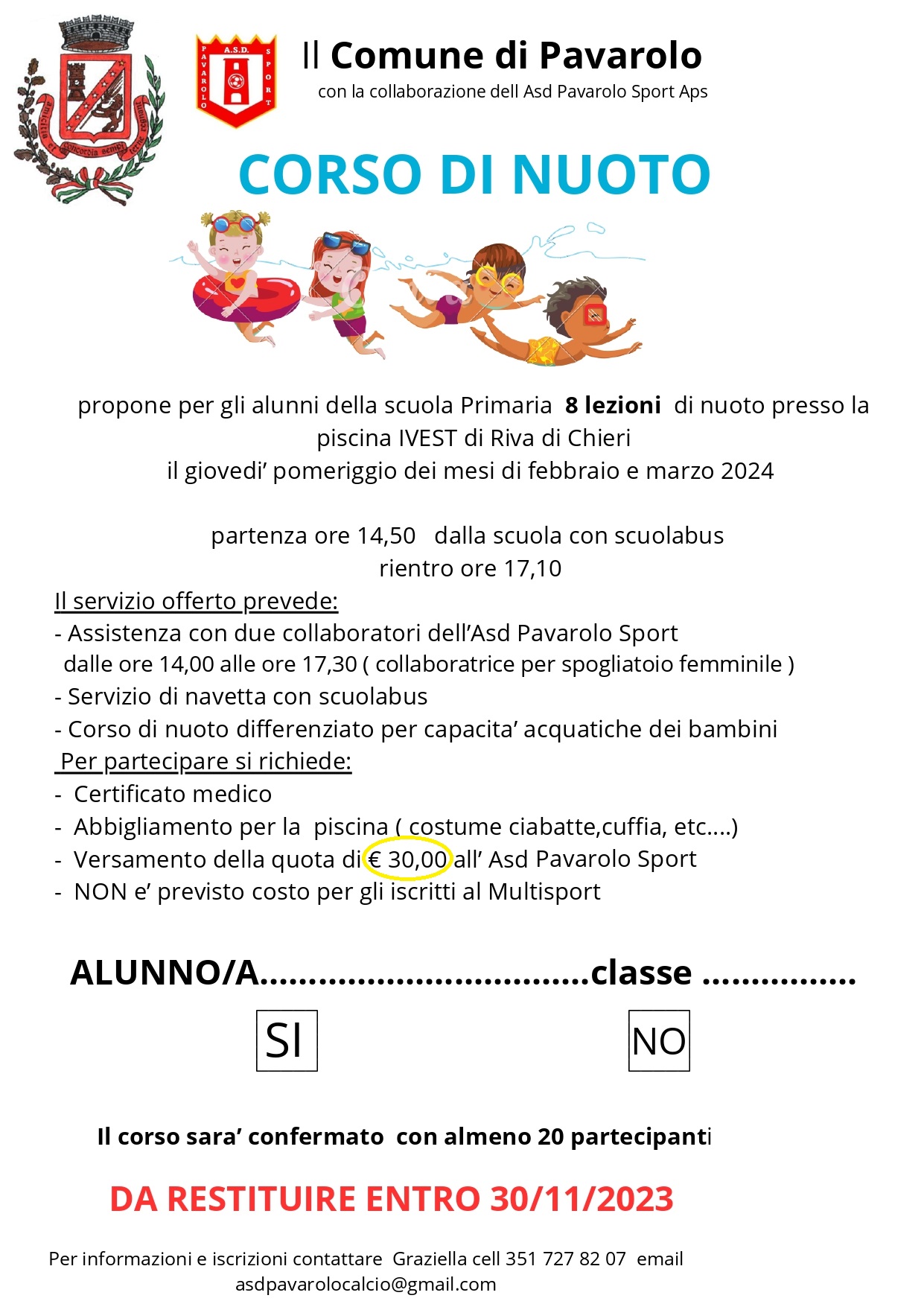 - Post-scuola tutti i giorni con attività sportive, aiuto compiti e laboratori didattici [LINK ATTIVITA' EXTRA-SCOLASTICHE]. Il pomeriggio di attività sportiva multidisciplinare prevede attività al campo sportivo di Pavarolo con spostamento gratuito con scuolabus.