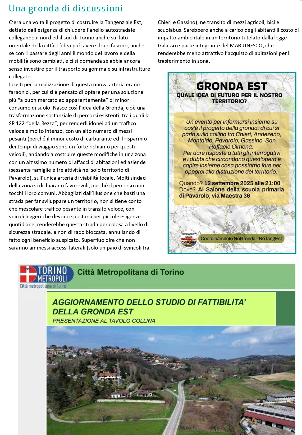 Martedì 1° ottobre 2024 si è svolto un tavolo tecnico presso la sede del Comune di Pavarolo nell’ambito dello studio di fattibilità preliminare al progetto della Gronda Est, prevista nel PUMS (Piano Urbano di Mobilità Sostenibile) del 2022 redatto dalla Città metropolitana .