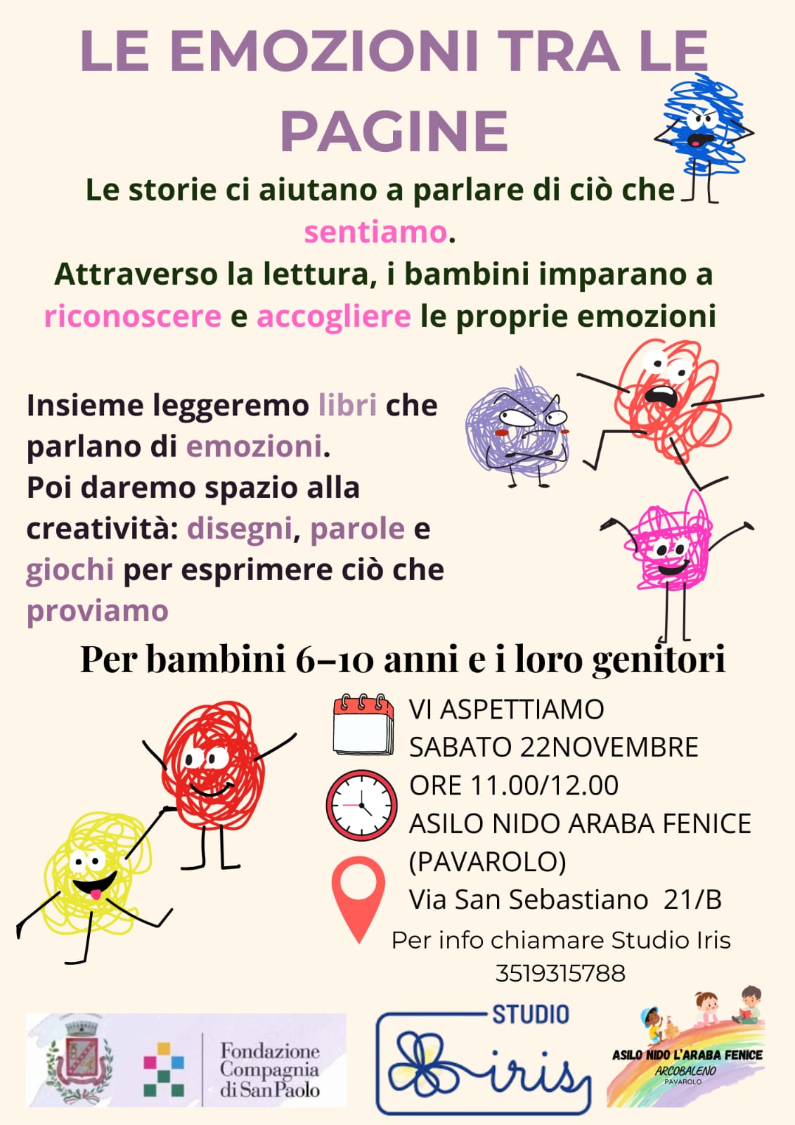 - ore 11:00 Emozioni tra le pagine, incontro di lettura 6-10 anni (con le dott.sse dello Studio IRIS)