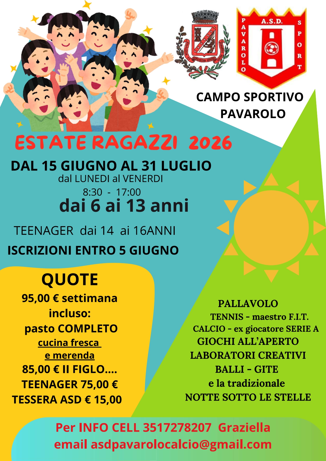 Il Comune di Pavarolo, in collaborazione con ASD Pavarolo Sport e L’Arcobaleno, invita tutti i bambini e i ragazzi dai 3 ai 16 anni a vivere un’estate indimenticabile tra sport, gioco e natura.